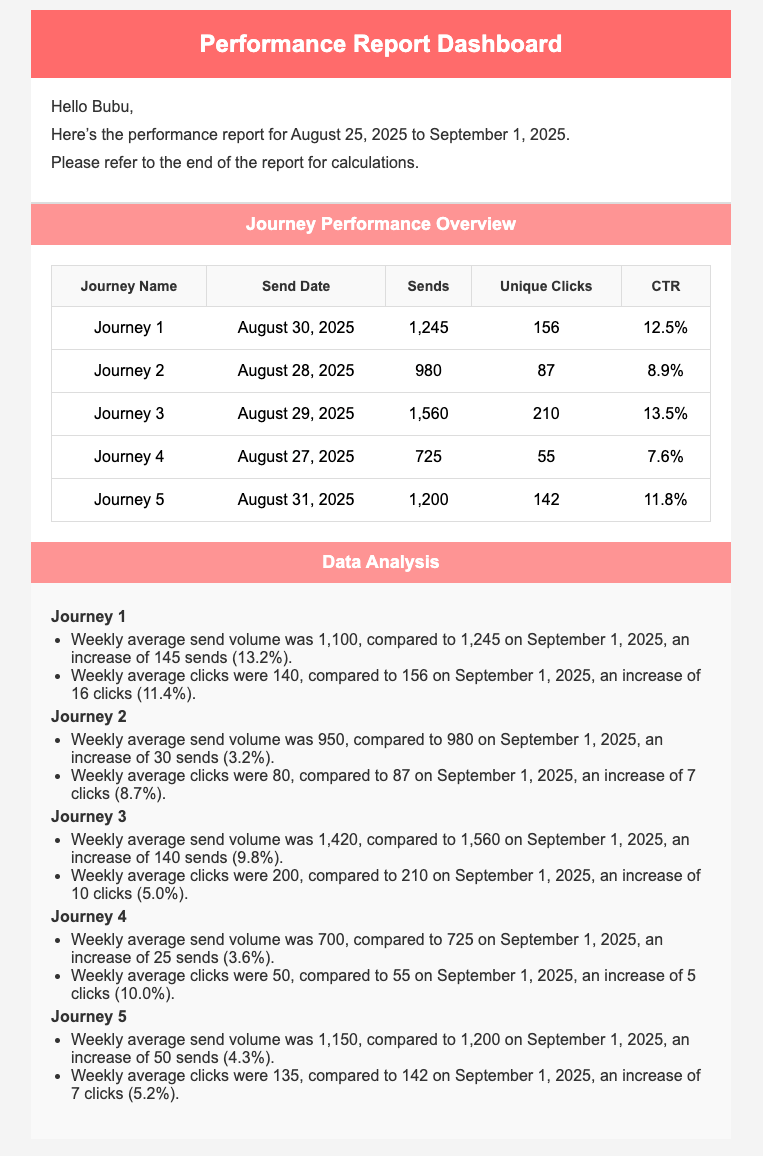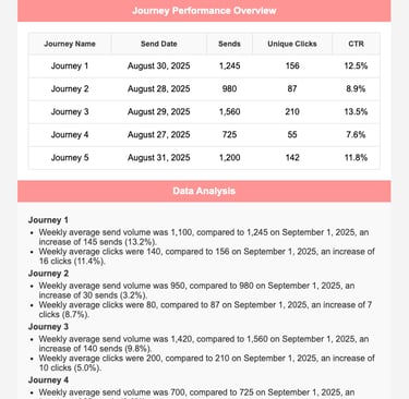 “Journey A sent 1,245 emails. Clicks went down 12%.”